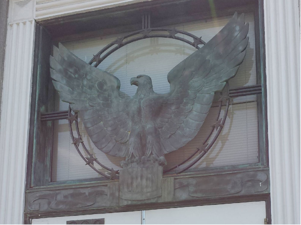 The band of brickwork relief in concert with a simple polished granite frieze and carved fluted wood window casings give the buildings its’ understated yet decorative character. The building’s boldest feature is the sculpted bronze eagle perched above the entrance greeting all visitors. The building was added to the National Register of Historic Places on May 11, 1989.